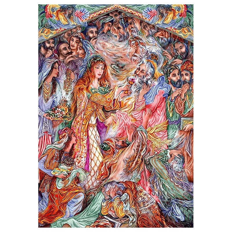 نخ و نقشه تابلوفرش دستباف طرح سلیمان با 130 رنگ و 15 رنگ ابریشم به ابعاد 534 رج در 500 گره (رجشمار 46) و سایز 96 در 76 سانتی متر تهیه شده از با کیفیت ترین نخ های مرینوس و ابریشم. بصورت گلوله شده و همراه با نقشه کامپیوتری و صوتی