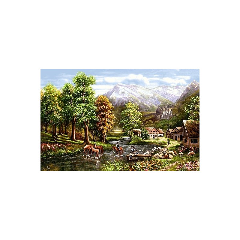 نخ و نقشه تابلوفرش دستباف طرح روستای کوچک با 100 رنگ و 15 رنگ ابریشم به ابعاد 340 رج در 530 گره (رجشمار 46) و سایز 51 در 80 سانتی متر تهیه شده از با کیفیت ترین نخ های مرینوس و ابریشم. بصورت گلوله شده و همراه با نقشه کامپیوتری و صوتی