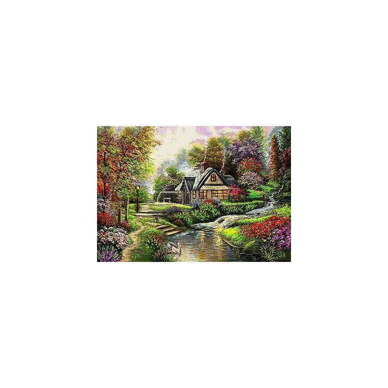 نخ و نقشه تابلوفرش دستباف طرح کلبه کنار رود با 66 رنگ و 12 رنگ ابریشم به ابعاد 280 رج در 400 گره (رجشمار 46) و سایز 42 در 60 سانتی متر تهیه شده از با کیفیت ترین نخ های مرینوس و ابریشم. بصورت گلوله شده و همراه با نقشه کامپیوتری و صوتی
